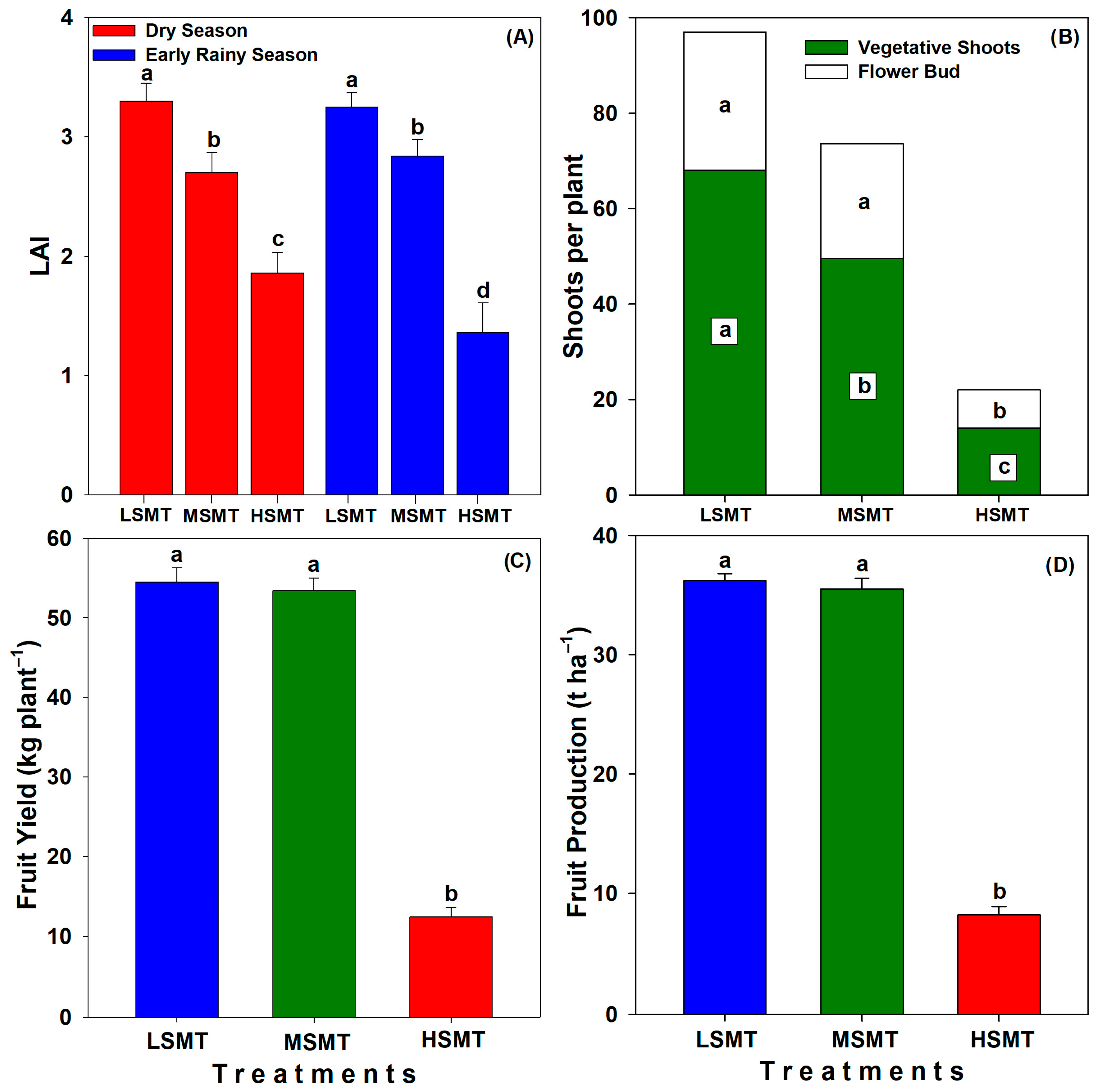 3.4. Leaf Area Index, Shoot Growth, and Yield