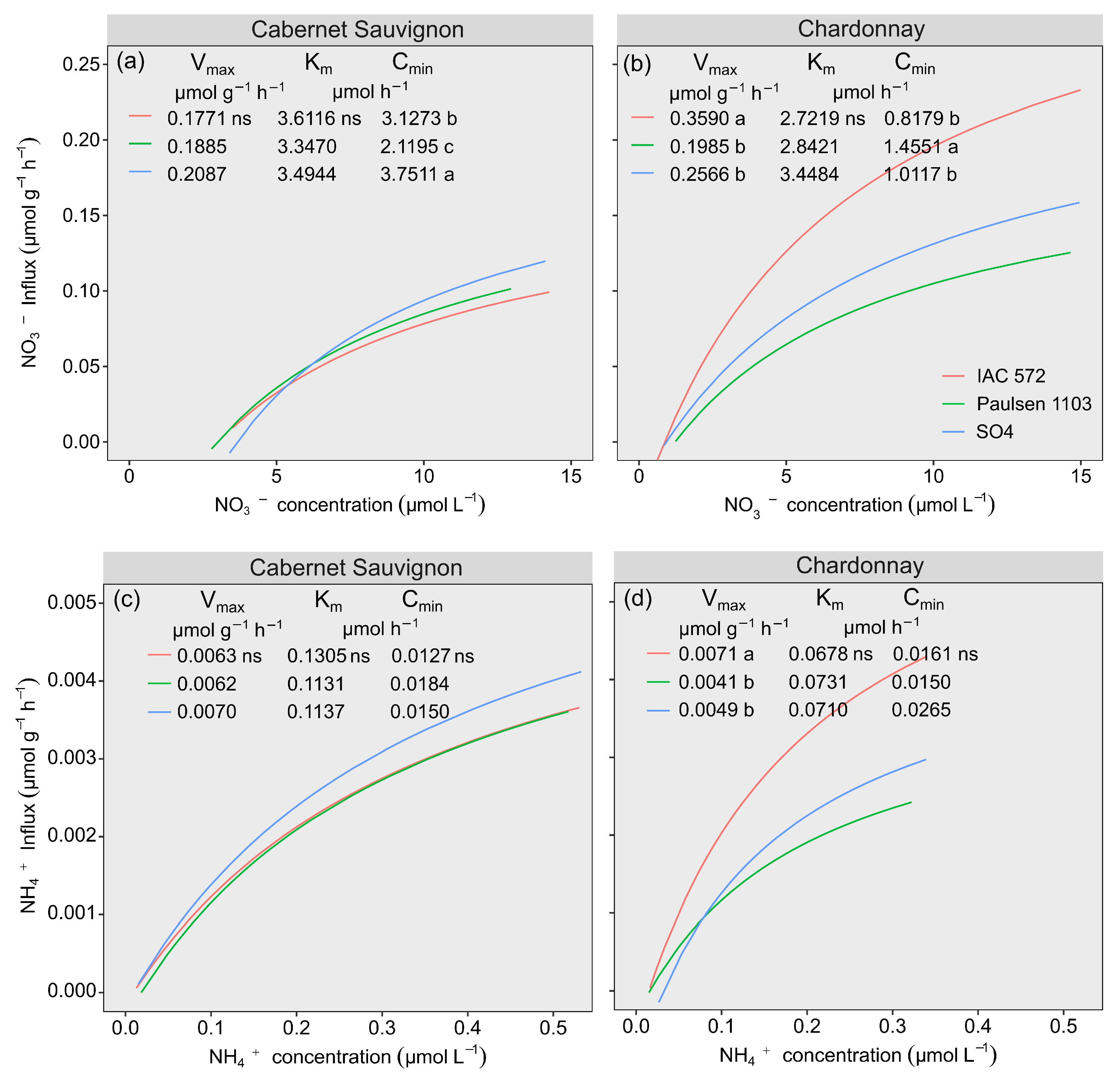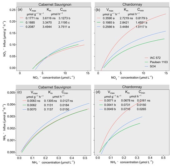 Influx and uptake kinetic parameters of NO3− and NH4+ from ‘Cabernet Sauvignon’ (a,c) and ‘Chardonnay’ (b,d) grapevines grafted onto ‘IAC 572’, ‘Paulsen 1103’ and ‘SO4’ rootstocks grown in Hoagland nutrient solution after 15 d of reduced internal nutrient reserves. Lower case letters compare rootstocks in each cultivar by the Tukey test (p < 0.05). ns = not significant.
