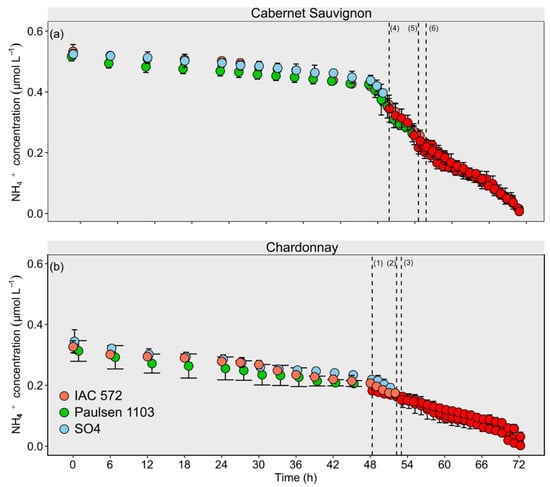 Concentration decay of NH4+ from ‘Chardonnay’ (a) and ‘Cabernet Sauvignon’ (b) grapevines grafted onto ‘IAC 572’, ‘Paulsen 1103’ and ‘SO4’ rootstocks grown in Hoagland nutrient solution after 15 d of reduced internal nutrient reserves. Superscript numbers represent the time to reach the lowest concentration (p < 0.05) in ‘Chardonnay’ on rootstocks (1) IAC 572; (2) Paulsen 1103; and (3) SO4; and in ‘Cabernet Sauvignon’ on rootstocks (4) IAC 572; (5) Paulsen 1103; and (6) SO4. Red dots: time reaching lowest concentration p < 0.05.