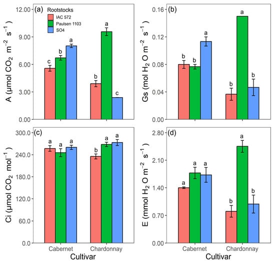 The highest A and Gs values in ‘Cabernet Sauvignon’ were recorded for rootstock ‘SO4’ (Figure 5a,b). Ci and E concentrations did not statistically differ among the assessed rootstocks (Figure 5c,d). The highest A, Gs and E values were recorded for rootstock ‘Paulsen 1103’ in cultivar Chardonnay (Figure 5a,b,d). The highest Ci values were observed when ‘Chardonnay’ was grafted onto rootstocks ‘Paulsen 1103’ and ‘SO4’ (Figure 5c).