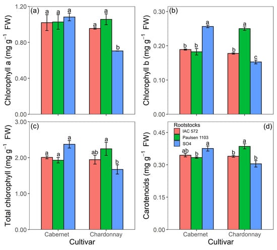 Chlorophyll a and total chlorophyll concentrations in ‘Cabernet Sauvignon’ did not statistically differ among rootstocks ‘Paulsen 1103’, ‘IAC 572’ and ‘SO4’. ‘Chardonnay’ showed the highest chlorophyll a and total chlorophyll concentrations in rootstocks ‘Paulsen 1103’ and ‘IAC 572’ (Figure 8a,c). The highest chlorophyll b and carotenoid concentrations in ‘Cabernet Sauvignon’ were observed when this cultivar was grafted onto rootstock ‘SO4’ and in ‘Chardonnay’ grafted onto ‘Paulsen 1103’ (Figure 8c,d).