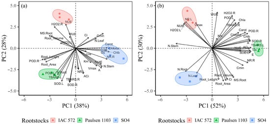 Relation between principal component 1 (PC1) and principal component 2 (PC2) from kinetic parameters (Vmax, Km and Cmin), morphological parameters (dry mass, N concentration in organs and root morphology), physiological parameters (photosynthesis), biochemicals (SOD, POD, H2O2, TBARS and nitrate reductase in the leaves and roots) and photosynthetic pigments (chlorophyll a, b, total and carotenoids) of the grapevines ‘Cabernet Sauvignon’ (a) and ‘Chardonnay’ (b) grafted onto ‘IAC 572’, ‘Paulsen 1103’ and ‘SO4’ rootstocks.