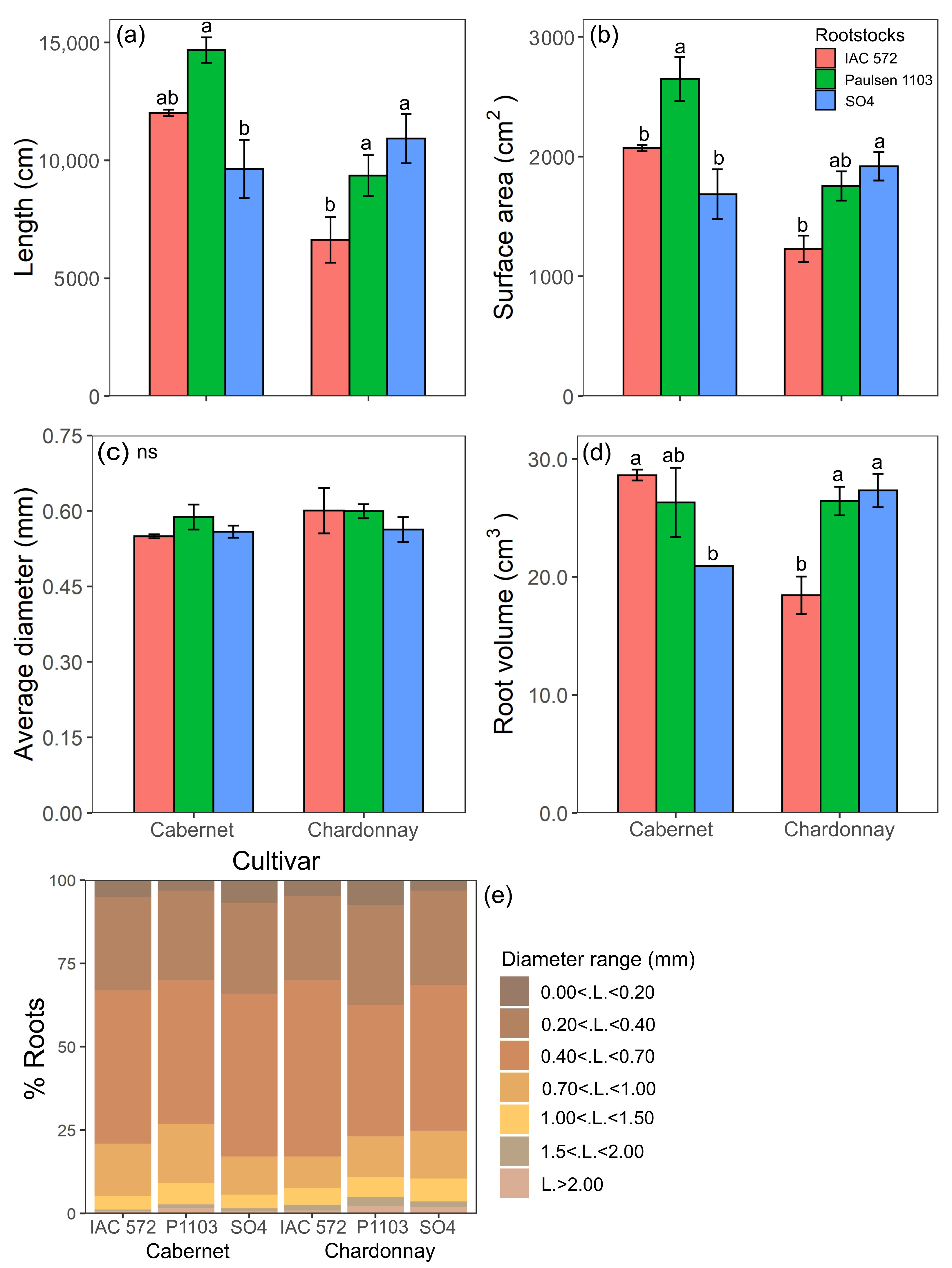 Length (a), surface area (b), average diameter (c), root volume (d) and percentage distribution of roots for each diameter range (e) of ‘Cabernet Sauvignon’ and ‘Chardonnay’ grapevines grafted onto ‘IAC 572’, ‘Paulsen 1103’ and ‘SO4’ rootstocks grown in Hoagland nutrient solution after 15 d of reduced internal nutrient reserves. Lower case letters compare rootstocks in each cultivar by the Tukey test (p < 0.05). ns = not significant. Vertical bars represent standard deviation.