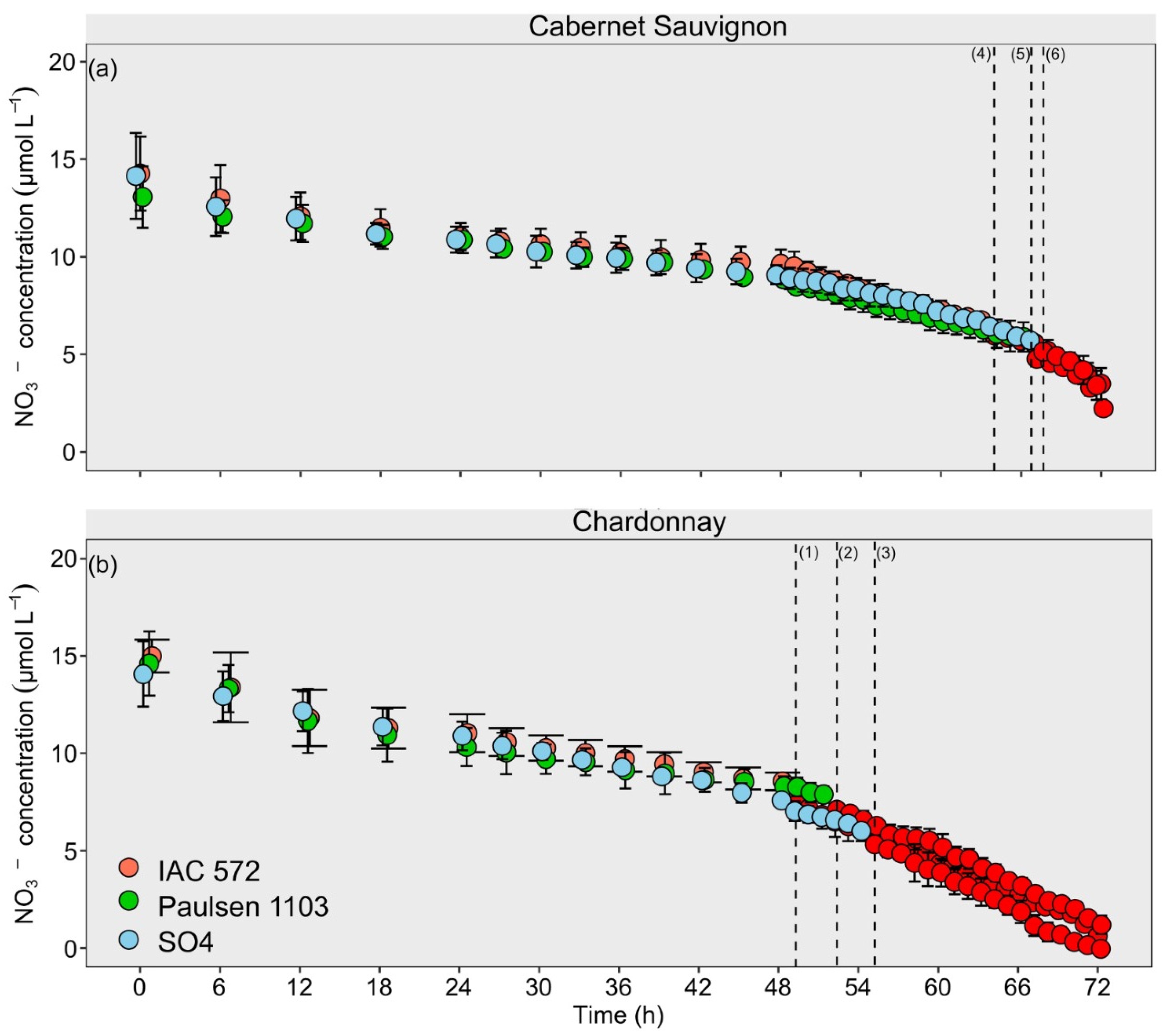 Concentration decay of NO3− from ‘Chardonnay’ (a) and ‘Cabernet Sauvignon’ (b) grapevines grafted onto ‘IAC 572’, ‘Paulsen 1103’ and ‘SO4’ rootstocks grown in Hoagland nutrient solution after 15 d of reduced internal nutrient reserves. Superscript numbers represent the time to reach the lowest concentration (p < 0.05) in ‘Chardonnay’ on rootstocks (1) IAC 572; (2) Paulsen 1103; and (3) SO4; and in ‘Cabernet Sauvignon’ on rootstocks (4) IAC 572; (5) Paulsen 1103; and (6) SO4. Red dots: time reaching lowest concentration p < 0.05.
