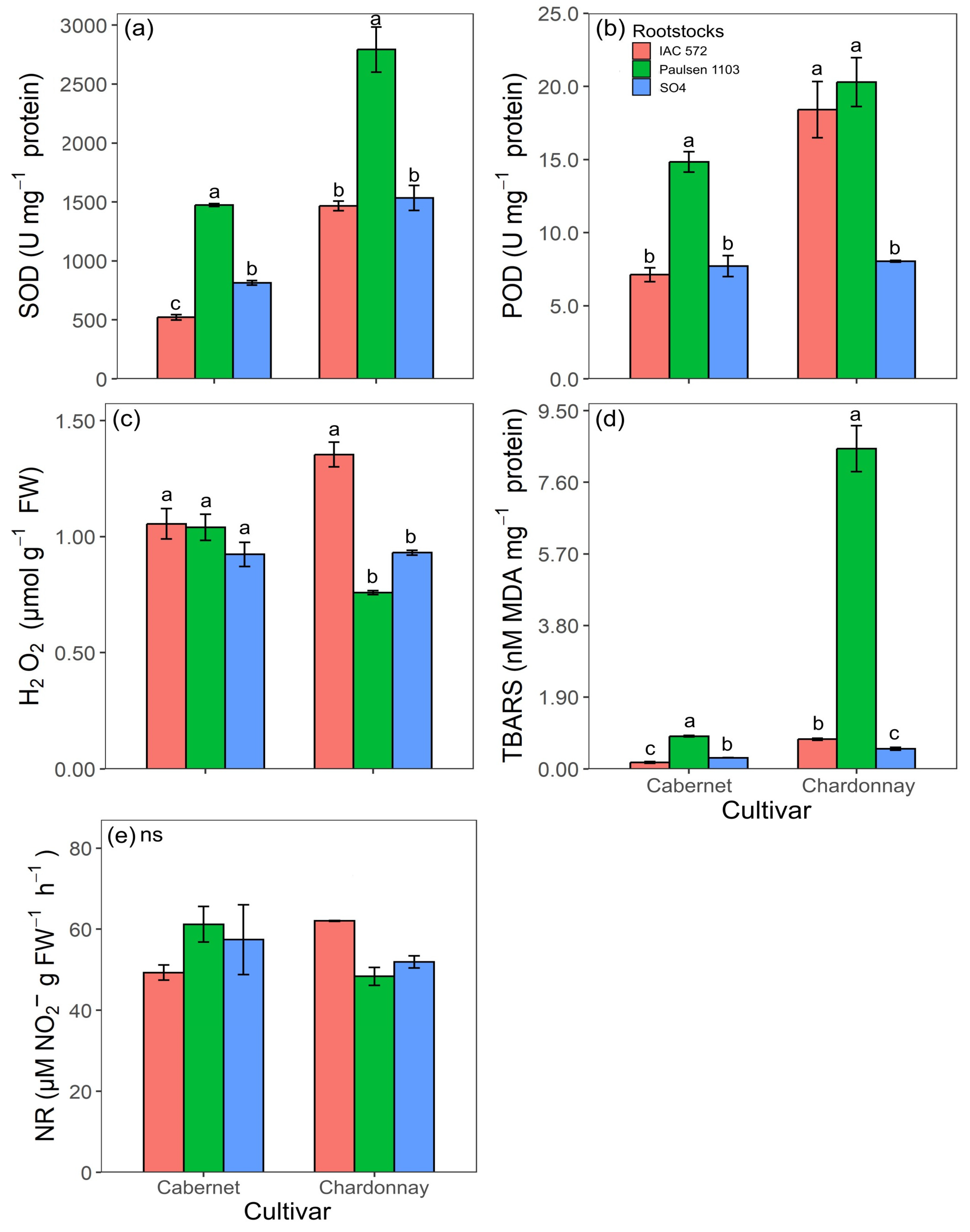 Superoxide dismutase activity (SOD) (a), guaiacol peroxidase activity (POD) (b), H2O2 concentration (c), MDA concentration (TBARS) (d) and nitrate reductase activity (NR) (e) in leaves of ‘Cabernet Sauvignon’ and ‘Chardonnay’ grapevines grafted onto ‘IAC 572’, ‘Paulsen 1103’ and ‘SO4’ rootstocks grown in Hoagland nutrient solution after 15 d of reduced internal nutrient reserves. Lower case letters compare rootstocks in each cultivar by the Tukey test (p < 0.05) (a, b, c). ns = not significant. Vertical bars represent standard deviation.