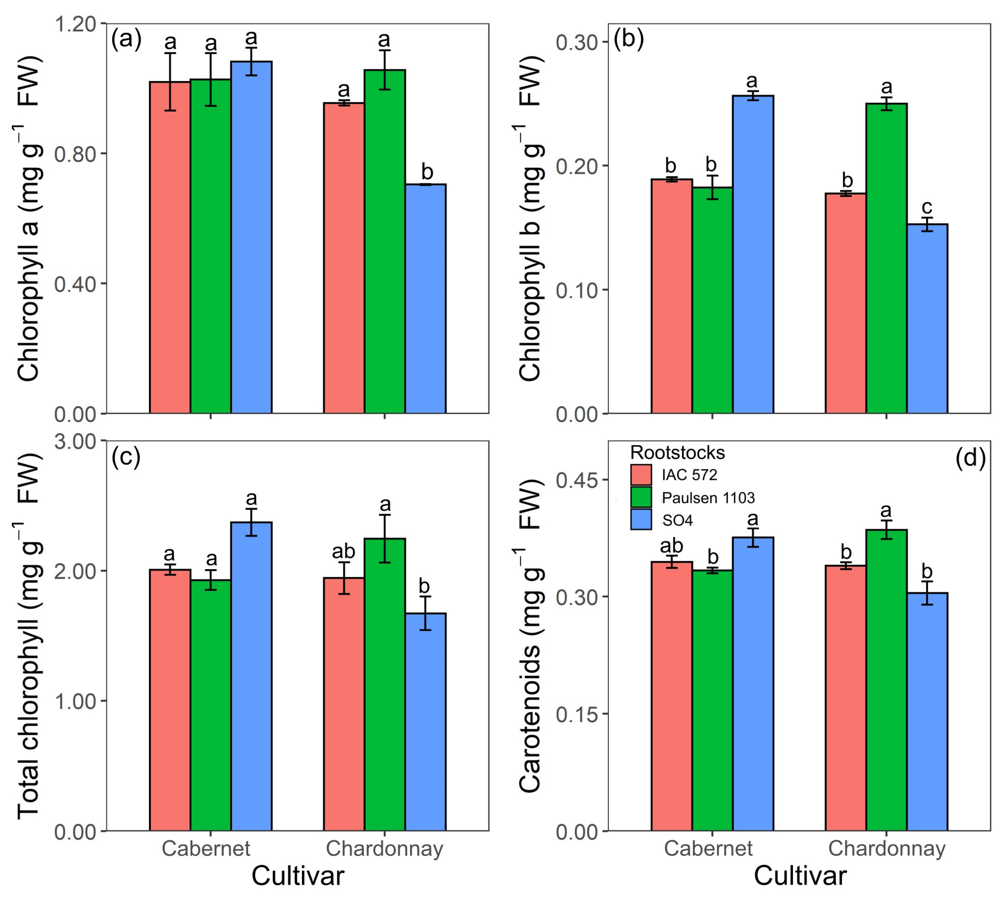 Chlorophyll a (a), chlorophyll b (b), total chlorophyll (c) and concentration of carotenoids (d) in leaves of ‘Cabernet Sauvignon’ and ‘Chardonnay’ grapevines grafted onto ‘IAC 572’, ‘Paulsen 1103’ and ‘SO4’ rootstocks grown in Hoagland nutrient solution after 15 d of reduced internal nutrient reserves. Lower case letters compare rootstocks in each cultivar by the Tukey test (p < 0.05) (a, b, c). Vertical bars represent standard deviation.