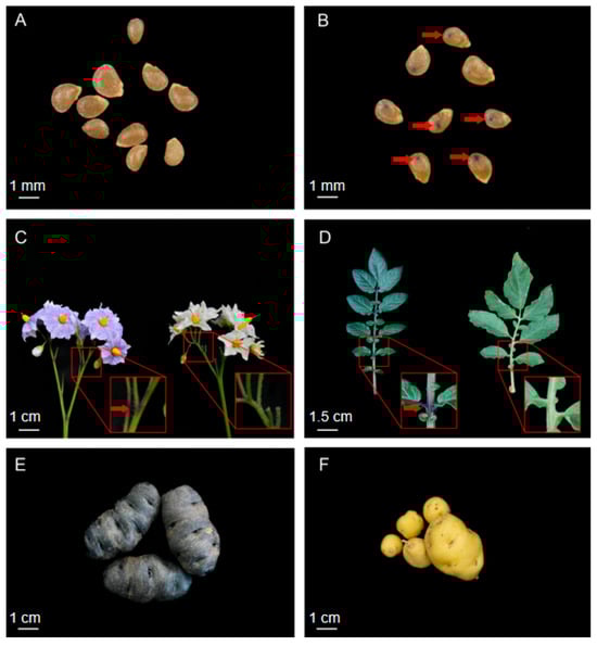 Representative images of plants with and without embryonic spots. (A) Non-spotted and (B) spotted seeds. Red arrows indicate deep purple pigmentation at the embryonic cotyledon base. (C) Inflorescence pigmentation. Y8 inflorescences have green floral abscission zones and white flowers, whereas IVP101 inflorescences have purple floral abscission zones and purple flowers. (D) Leaf base pigmentation. Y8 has green leaf bases, while IVP101 has purple petiole bases with intense deep purple stripes. (E,F) Tuber pigmentation. Y8 has yellow tuber epidermis, whereas IVP101 has purple tuber epidermis.