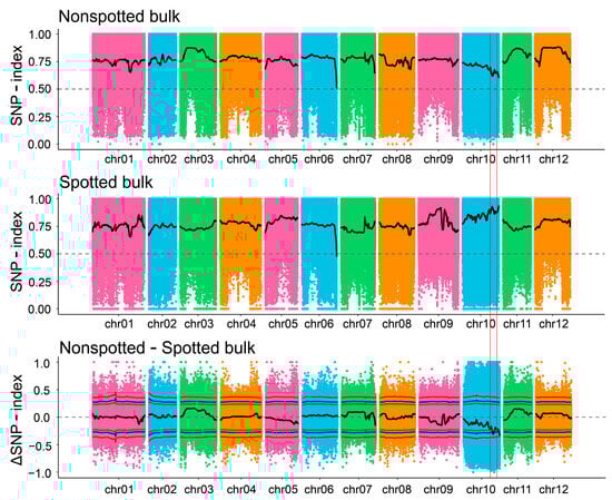 To identify genes controlling the embryonic spot trait, we performed BSA-seq analysis using the F1 segregating population. Sequencing generated 30.47 Gb of raw data for IVP101, 31.17 Gb for Y8, 34.49 Gb of reads for the spotted pool, and 30.79 Gb for the non-spotted pool (Table 1). Clean reads were aligned to the reference potato genome (DM8.1, http://www.bioinformaticslab.cn/pubs/dm8/, accessed on 10 April 2024) to identify single nucleotide polymorphisms (SNPs). A total of 9,616,190 SNPs were detected via BSA-seq, including 6,003,585 transitions and 3,612,605 transversions. After quality filtering, 4,948,424 high-quality SNPs were retained. The ΔSNP-index was fitted using the DISTANCE method, and regions exceeding the association threshold were selected as trait-related intervals. At a 95% confidence level, three candidate regions were identified. Two closely linked and small intervals were discarded, retaining a single candidate interval on chr10 (49.96–54.31 Mb) (Figure 2, Table 2).