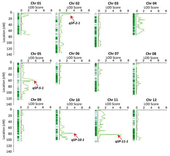 QTL mapping of the embryo spot trait in the F2 population was performed using a high-density genetic map. X-axis: LOD score; Y-axis: Genetic distance (centimorgan, cM). QTLs are labeled with their names (qSP2-1, qSP5-1, qSP10-1, qSP11-1).