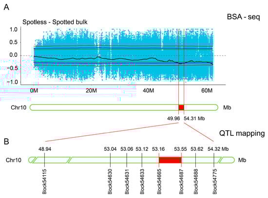 To dissect the genetic basis of embryo spots, this study employed a multi-step strategy involving BSA-seq-based initial mapping with the F1 population, quantitative trait locus (QTL) fine mapping using the F2 population, and candidate gene screening via transcriptome sequencing. This integrated strategy offers significant advantages over single methods. BSA-seq (bulked segregant analysis combined with whole-genome sequencing) is a powerful tool for preliminary mapping of major-effect loci [39]. In this study, two pools were constructed using 23 spotted and 23 non-spotted F1 individuals, and BSA-seq analysis identified a major associated region on chromosome 10 (49.96–54.31 Mb; Figure 2). The advantage of BSA-seq lies in its elimination of the need for large populations or high-density markers during the initial stage, thereby reducing both cost and time. By leveraging allelic frequency differences between the two pools, this study effectively excluded approximately 95% of the genome, focusing subsequent research efforts on an interval of approximately 4.3 Mb.