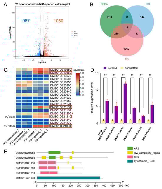 Analysis of candidate genes for embryonic spot formation. (A) Differentially expressed genes (DEGs) identified by RNA sequencing. Orange and blue dots represent upregulated and downregulated genes, respectively; black dots represent genes with no expression change. (B) Candidate gene identification via integration of significant DEGs, QTL interval genes, and all transcription factors. (C) Expression heatmap of genes within and flanking the candidate interval based on transcriptome sequencing. Red boxes indicate the five significantly differentially expressed genes, including the P gene; asterisks (*) denote an additional MYB family member with a non-significantly differentially expressed FPKM value. (D) qRT-PCR was performed to validate the expression levels of five candidate genes and F3′5′H. Error bars represent the standard deviation of the mean from three replicates, and ** denote significance at p < 0.01 (t-test). (E) Prediction of protein conserved domains of five candidate genes and the F3′5′H gene.