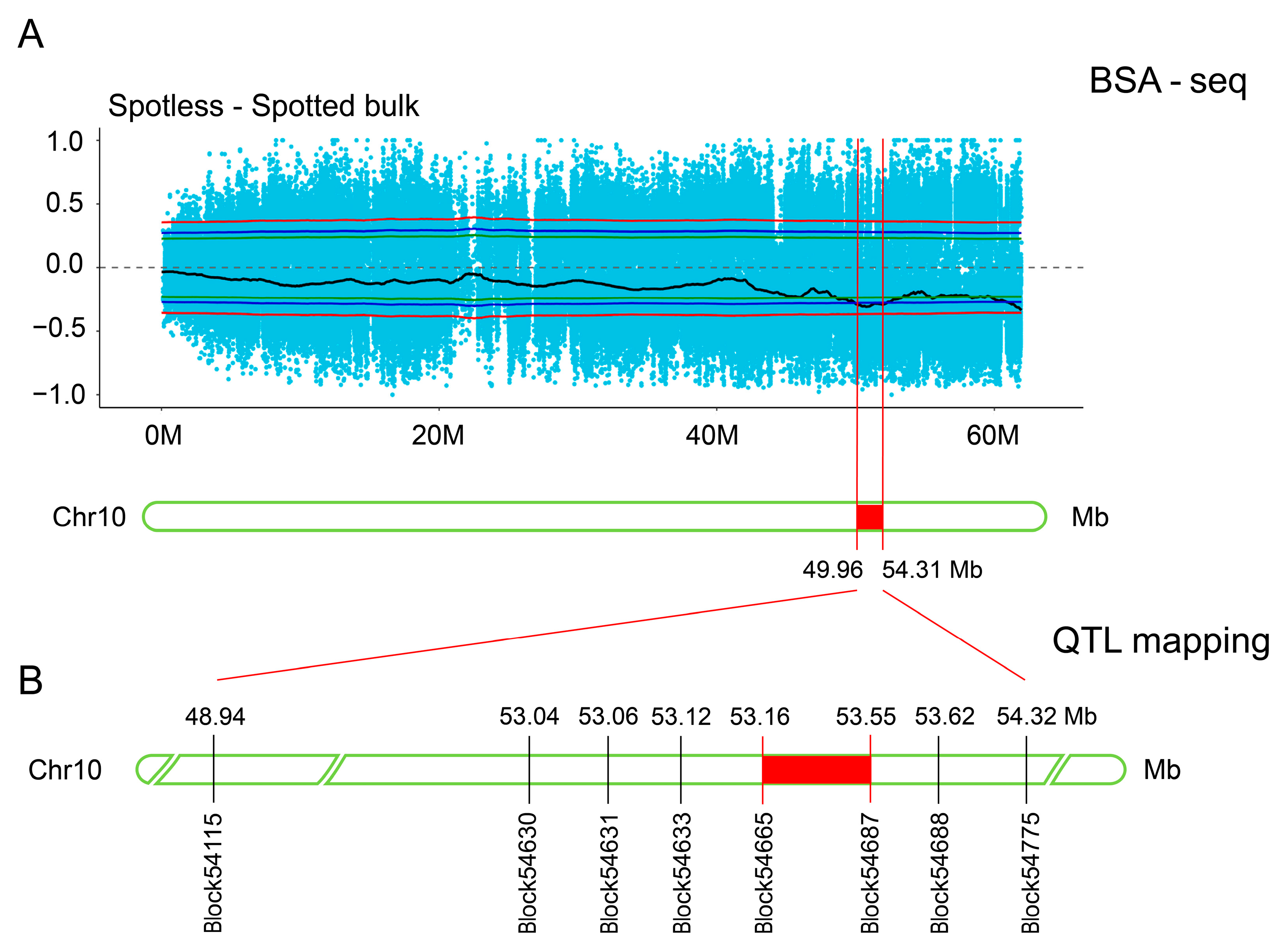 | qSP-10-1 | spotted | 10 | Block54665–Block54687 | 53,168,851–53,553,482 | 3.63 | 23.85 | 0.13 | 0.07 |