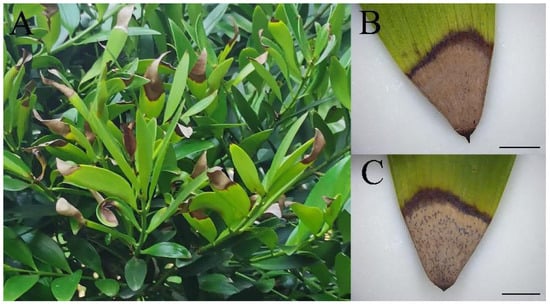 Naturally occurring leaf symptoms in Nageia fleuryi. (A) Different stages of infection (Lingshi Mountain). (B) Necrotic areas expanded toward the leaf base. (C) Fungal fruiting bodies. Scale bars = 4 mm.