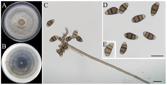 For microscopic observations, conidial and conidiophore characteristics were examined and photographed under a light microscope (ECLIPSE E200 MV, Nikon, Tokyo, Japan). The size of the 100 conidia was measured, and the conidial color, septation, and cell morphology were recorded. Identification followed descriptions in Manamgoda et al. (2014) and Deng et al. (2002) [12,13].