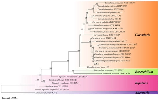 Genomic DNA of the isolate ZB-2 was extracted using a Fungus DNA Kit (D3390, OMEGA, Norcross, GA, USA) following the manufacturer’s instructions. The partial internal transcribed spacer (ITS), glyceraldehyde-3-phosphate dehydrogenase (GAPDH), and translation elongation factor 1-α (Tef1-α) genes were amplified using primers ITS1/ITS4 [14], Gpd1/Gpd2 [15], and EF1-983F/EF1-2218R [16], respectively. The primers were synthesized by Shangya Biotechnology Co., Ltd. (Fuzhou, China), and stored at −20 °C. Gene fragments were amplified in a 25 μL reaction mixture containing 12.5 μL Rapid Taq Master Mix (P222, Vazyme, Nanjing, China), 1 μL of each primer (10 μM), and 1 μL template DNA (10 ng). The same PCR conditions were used for all primer sets. The amplification procedure was as follows: initial denaturation at 95 °C for 3 min, 34 cycles of denaturation at 95 °C for 15 s, annealing at 55 °C for 15 s, and extension at 72 °C for 30 s, followed by a final extension at 72 °C for 5 min. The polymerase chain reaction (PCR) was performed using a thermal cycler (S1000, Bio-Rad, Singapore).