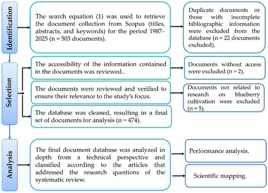 The initial search yielded a total of 503 documents published between 1987 and 2025. A rigorous screening process was subsequently applied to ensure the quality and relevance of the information. At this stage, duplicate records (n = 13), documents with incomplete metadata or without access (n = 11), and publications not directly related to the study topic (n = 5) were removed. As a result, a final database consisting of 474 valid documents was obtained. These were exported in CSV and BibTeX formats, preserving all essential metadata, including authors, affiliations, year of publication, keywords, abstracts, source, and references required for subsequent analysis. Inclusion criteria considered original research articles, review papers, book chapters, and conference proceedings, provided they were peer reviewed, and their content contributed directly to knowledge on blueberry (Vaccinium spp.) within the framework of protected agriculture, sustainable production, postharvest, and international marketing. This process made it possible to consolidate a solid and representative information base suitable for exploring the scientific evolution and thematic interconnections within the field of study [26].
