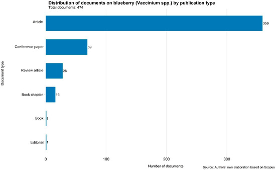 The analysis of the distribution of documents (Figure 3) by publication type shows a scientific structure dominated by research articles, which accounts for more than 75% of the total (359 out of 474 documents). This predominance evidences the consolidation of blueberry (Vaccinium spp.) as a formally established field of study within the academic literature, supported by the publication of peer-reviewed experimental results [41]. The analysis of document distribution by publication type reveals a scientific output largely dominated by research articles, which account for over 75% of the total (359 out of 474 documents). This predominance indicates that research on blueberry (Vaccinium spp.) has become a formally established scholarly field, sustained primarily by the dissemination of peer-reviewed experimental findings [42]. Review articles (28) confirm the maturity of the field, since this type of document typically emerges when there is a sufficiently broad body of knowledge to be systematized and critically examined.