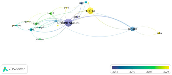 In Europe, scientific production is concentrated mainly in Spain (20 documents), Italy (19), the United Kingdom (16), and Poland (15), with significant contributions in biotechnology, nutraceutical quality, and sustainability. These countries focus their research on secondary metabolism and the assessment of the fruit’s antioxidant potential, as well as on environmental studies centered on life cycle analysis associated with blueberry production [39,78,79,80,81]. Likewise, Portugal (10) and Germany (9) stand out in research lines related to processing technologies and postharvest quality of the fruit or derived products [82,83].