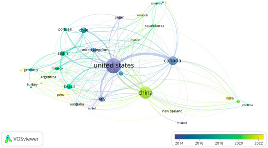 The bibliographic coupling network (Figure 7) makes it possible to identify those countries whose publications share a common referential base, that is, those that cite the same scientific sources in their studies on Vaccinium spp. [18]. In this network, composed of 48 countries and a total link strength of 4917, the United States (162 documents, strength 917), Canada (56, 421), and China (111, 330) emerge as the main articulation nodes, reflecting their dominant role in shaping the conceptual and methodological framework of the field [91]. The high overlap in cited references evidences an academic dependency on these countries, which act as cognitive structuring hubs for global research on blueberry physiology, genetics, and postharvest.