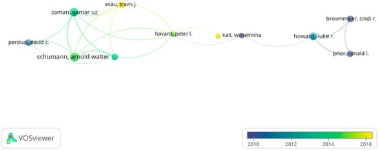 The co-authorship network (Figure 8) reveals the collaborative structure underlying scientific production on Vaccinium spp., comprising 11 main authors, 20 links, and a total link strength of 75, which together reflect a medium level of cooperation and a clear thematic organization. Rather than providing merely descriptive statistics, this network illustrates how specific author groups have shaped the conceptual and methodological evolution of blueberry research over time.