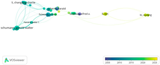 The bibliographic coupling network among authors (Figure 9) makes it possible to identify the extent of intellectual relatedness based on overlaps in the references cited in their publications, where a higher degree of coupling indicates that researchers are grounding their work on a similar bibliographic corpus [25]. In this case, the network is composed of 61 authors connected through 227 links, with a total link strength of 3742, which represents a consolidated and highly cohesive system of scientific collaboration. The link strength reflects the degree of thematic proximity among authors: the higher the value, the greater the similarity in the references used and, therefore, the closer the conceptual alignment of their research lines [106,107]. Arnold Walter Schumann (11 documents, 159 citations, link strength 465), Qamar Uz Zaman (10 documents, 156 citations, link strength 464), and Li Changying “Charlie” (7 documents, 201 citations, link strength 363) stand out, forming the densest core of the network. This group leads research on precision agriculture, computer vision, and intelligent mechanization, demonstrating a high degree of interdependence in the production of knowledge applied to mechanical harvesting, maturity estimation, and automated management of blueberry fields.
