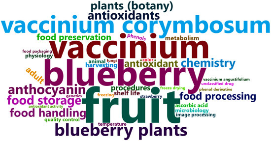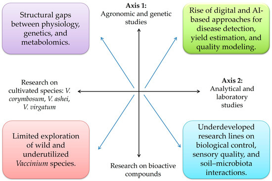 Over the past decades, scientific research on blueberry (Vaccinium spp.) has shifted from a predominantly agronomic and physiological lens toward a broader interdisciplinary framework that now integrates biotechnology, food science, engineering, postharvest technology, and human health [8,9,10]. This diversification reflects both the geographic expansion of the crop and the growing valuation of its bioactive compounds, resulting in research agendas centered on productivity, quality, traceability, and sustainability [11,12,13]. As scientific output becomes more heterogeneous, synthesis tools are needed to describe the field’s evolution, its core knowledge structures, and its thematic and institutional interdependencies.