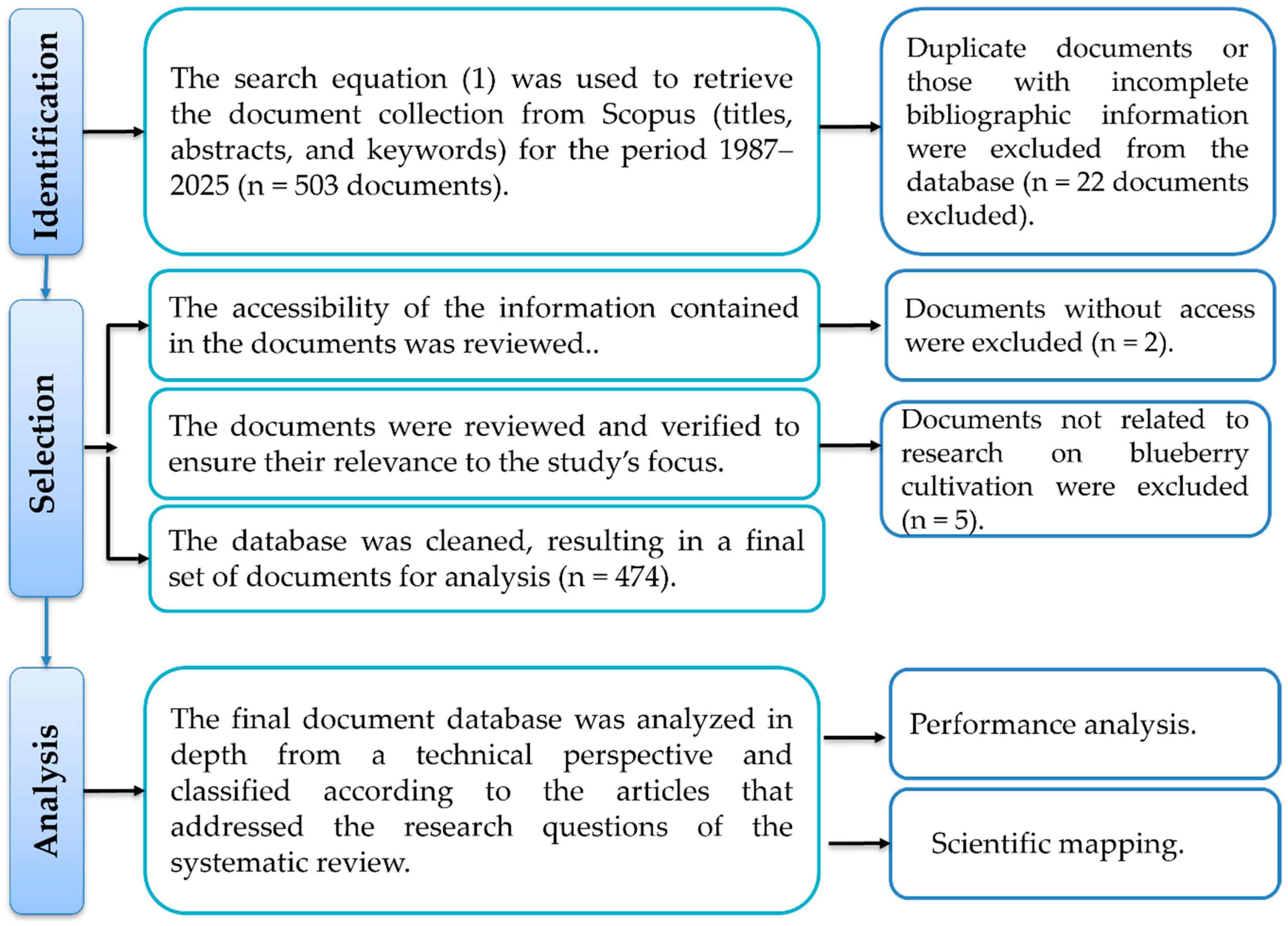 - TITLE-ABS-KEY (blueberry OR “Vaccinium corymbosum” OR “Vaccinium spp.”) AND TITLE-ABS-KEY (“protected cultivation” OR “protected agriculture” OR “greenhouse” OR “tunnel” OR “shade net” OR “net house” OR “agribusiness” OR “fair trade” OR “processing”) AND TITLE-ABS-KEY (irrigation OR fertigation OR fertilization OR “nutrient management” OR pruning OR training OR “crop management” OR “harvest” OR “postharvest” OR “storage” OR “shelf life” OR “diseases” OR “pests” OR “crop protection” OR “biological control” OR “Transformation” OR “Commercialization” OR “Marketing” OR “export” OR “markets”).