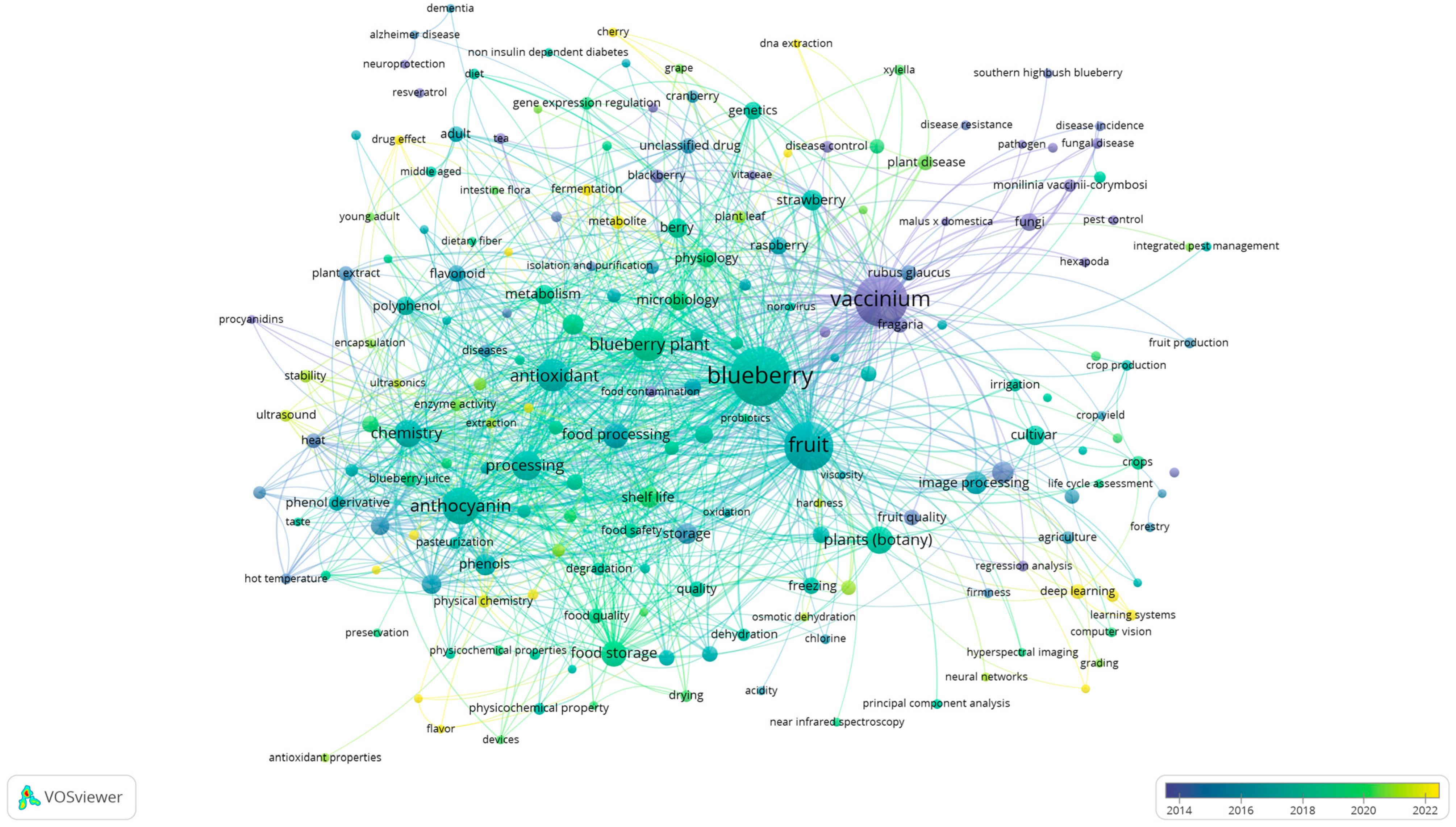 - Yuan, B.-Z.; Sun, J. Bibliometric Analysis of Blueberry (Vaccinium corymbosum L.) Research Publications Based on Web of Science. Food Sci. Technol. 2021, 42, e96321. [Google Scholar] [CrossRef]