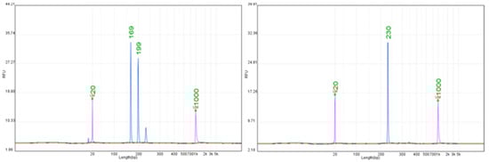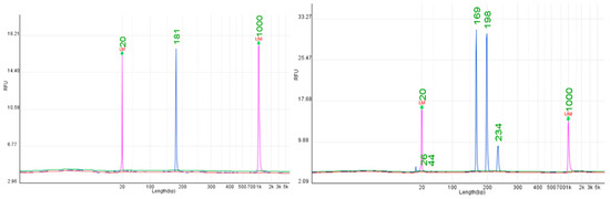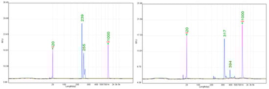 PCR reactions were performed as described above, using fluorescently labeled primers suitable for ABI analysis. Amplicons were sent to Macrogen Inc. (Seoul, Republic of Korea), where they were separated on an ABI capillary electrophoresis platform (Applied Biosystems, Foster City, CA, USA). Allele sizes were scored with GeneMapper software (Applied Biosystems). For each marker, PCR products from the same genotypes were also analyzed on the Qsep100 system to enable direct comparison of allele sizing across platforms. Concordance was assessed by calculating the absolute difference in allele size (Δbp) between ABI and Qsep100 for each allele call. A tolerance of ±2 bp was defined as concordant (match), 3–5 bp as a minor shift, and greater than 5 bp as discordant. Expected allele sizes were taken from the literature (Indel-27: 230 bp; UDV737: 281 bp) and used as reference values in the comparative analysis.