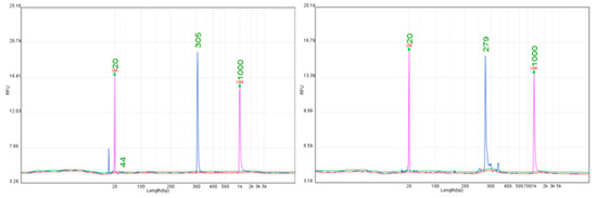 Representative electropherograms for the Rpv3 locus obtained with SSR markers UDV 305 (305 bp) and UDV 737 (279 bp).