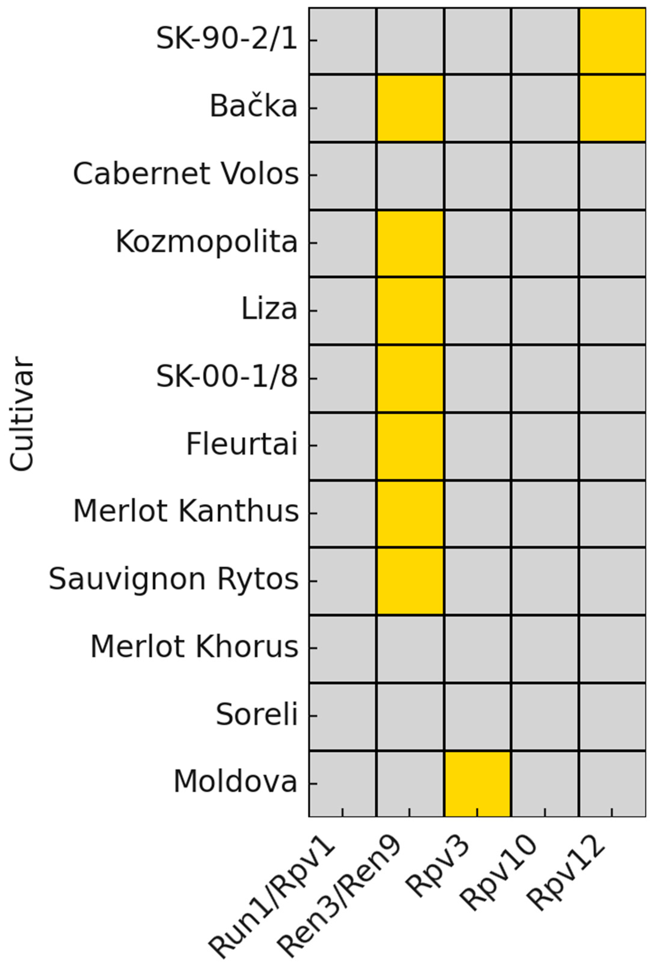 | Cultivar | Origin | Run12 | Ren33 | Ren93 | Rpv12 | Rpv3 | Rpv10 | Rpv12 | Ref. | ||