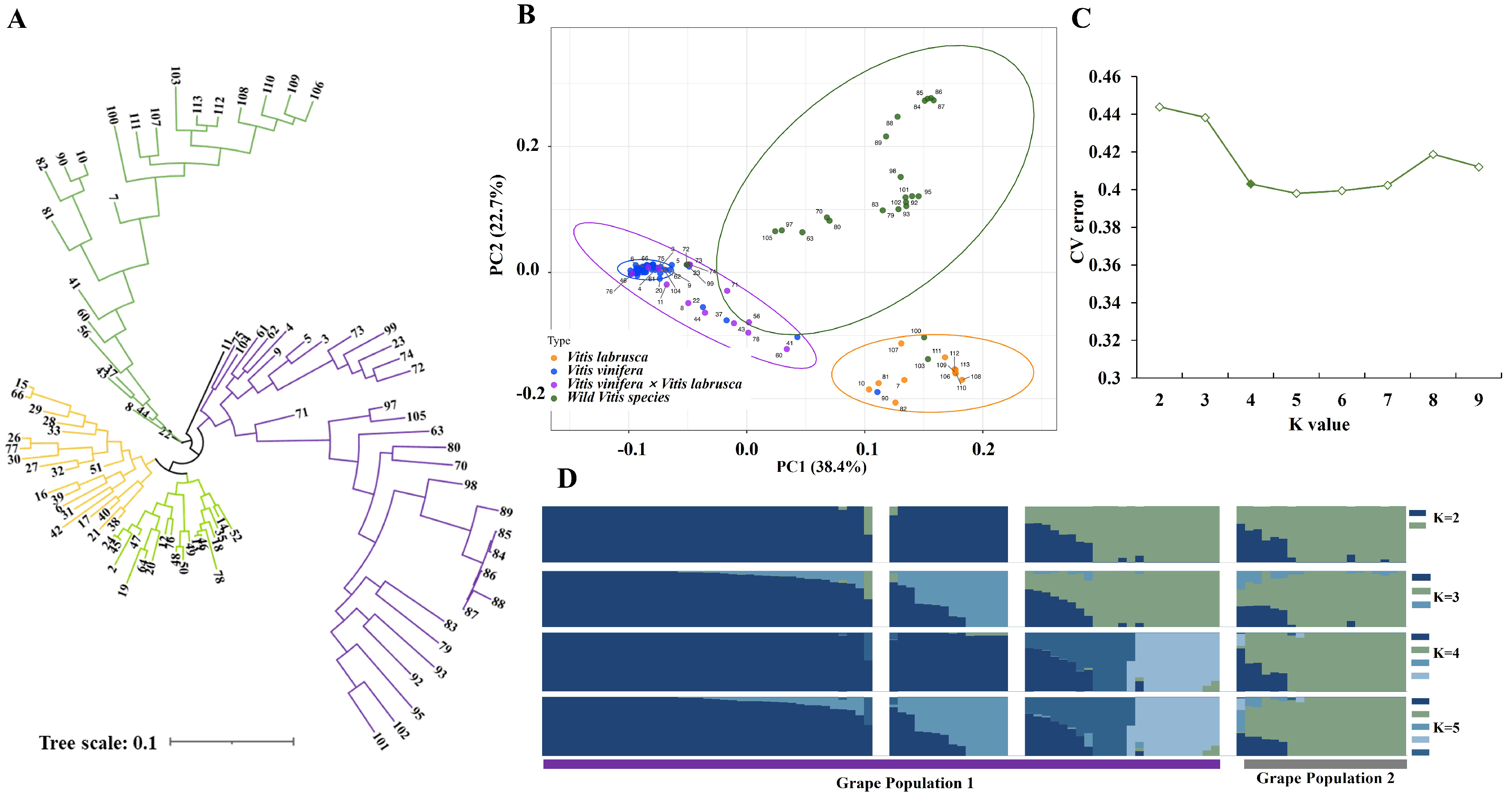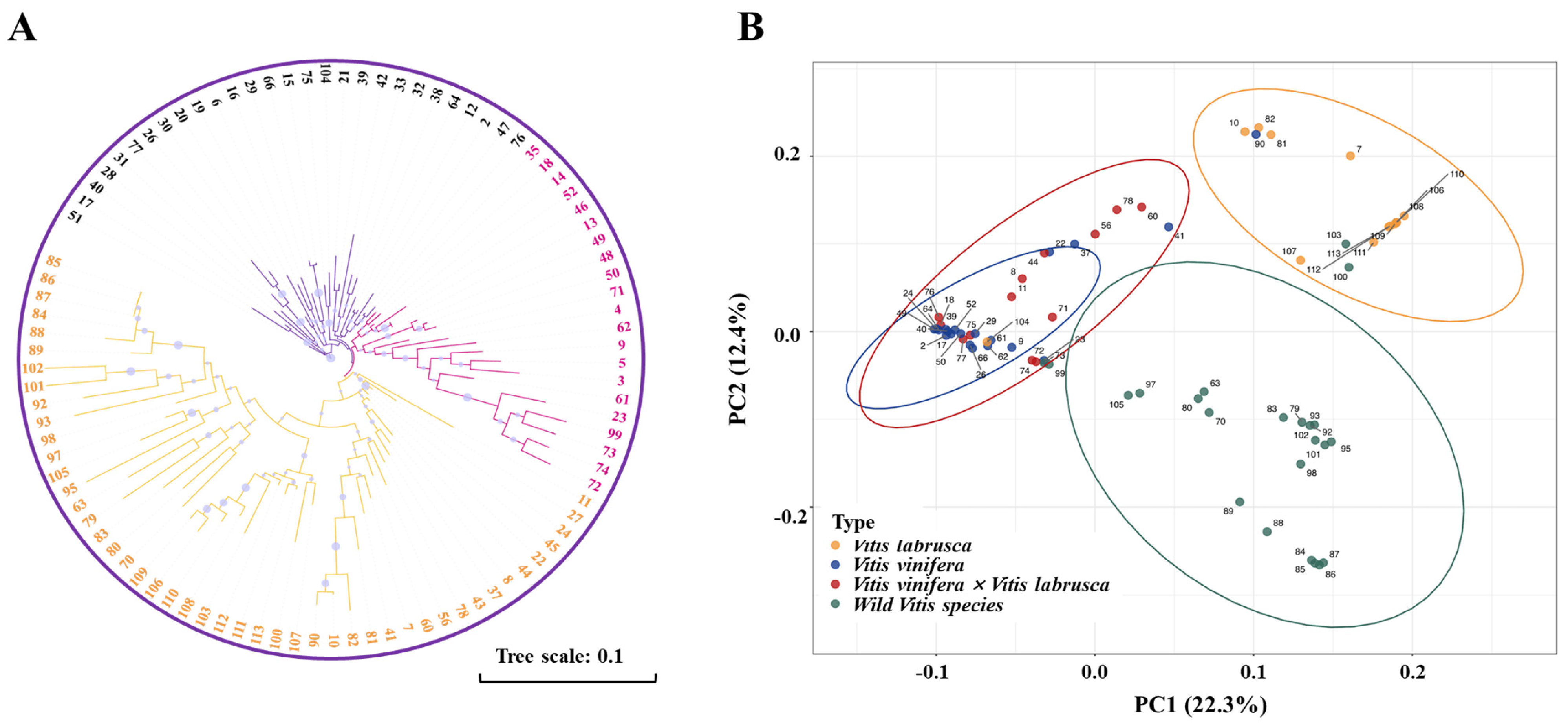 3.1. Genetic Diversity Analysis of Grape Accessions