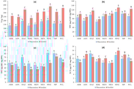 Mean comparison for extraction yield (Y) (a), total phenolic content (TPC) (b), total flavonoid content (TFC) (c), and total condensed tannins (TCTs) (d) among olive leaves extracts from nine varieties grown in Morocco obtained using two extraction methods (Maceration and Soxhlet). Y is expressed as g of extract per kilogram of dry olive leaves (g/kg), TPC is expressed as µg of gallic acid equivalent (GAE) per milligram dry weight (mg DW). TFC is expressed as µg of quercetin equivalent (QE) per milligram dry weight (mg DW). TCT is expressed as µg of catechin equivalent (CE) per milligram dry weight (mg DW). Different letters above the bars (lowercase for maceration and uppercase for Soxhlet) indicate statistically significant differences at p < 0.05 according to LSD test. ARB = Arbequina; ASN = Arbosana; HAZ = Haouzia; KRK = Koroneiki; MEN = Menara; MES = Meslala; MNZ = Manzanilla; MP = Moroccan Picholine; PCL = Picual.