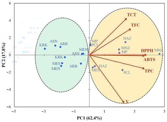 Principal component analysis (PCA) was performed on the correlation matrix based on mean values to establish the combination of each factor (variety and extraction methods) with the studied variables. The obtained results (Figure 2) revealed that 80.2% of the total observed variability was explained by the first two principal components (PC); with PC1 explaining the largest proportion (62.4%) and PC2 contributing to an additional 17.8%. PC1 was strongly associated with extraction yield (Y), total phenolic content (TPC), total flavonoid content (TFC), and antioxidant activities (DPPH, ABTS), all oriented toward the positive direction of this axis. Varieties located on the positive side of PC1 (Manzanilla, Haouzia, Moroccan Picholine, and Picual) were characterized by higher bioactive compound levels and stronger antioxidant potential. In contrast, Arbequina, Arbosana, Koroneiki, and Menara projected on the negative side of PC1, exhibited lower phenolic contents and weaker antioxidant performance. Meslala occupied an intermediate position, reflecting moderate overall phytochemical and antioxidant profile. PC2 was mainly associated with total condensed tannins (TCT), separating varieties with higher tannin accumulation toward the upper region of the plot. Extraction yield contributed negatively along PC2, suggesting that samples richer in tannins tended to exhibit slightly lower extraction efficiency. This spatial distribution along the two axes PC1 and PC2 confirms the existence of distinct varietal groupings driven primarily by genotypic differences in phenolic biosynthesis and extractability.