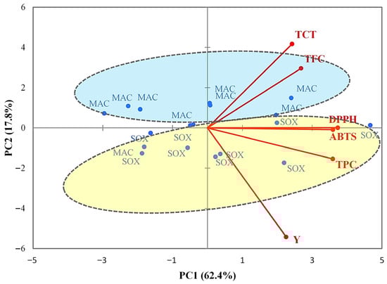 PCA projections on axes 1 and 2, accounting for 80.2% of the total variance. Eigenvalues of the correlation matrix are symbolized as vectors representing traits that most influence each axis. The 18 points representing trait means for each extraction method are plotted on the plane determined by axes 1 and 2. Y = Extraction yield, TPC = Total phenol content, TFC = Total flavonoid content, TCT = Total condensed tannins, DPPH = 2,2-diphenyl-1-picrylhydrazyl, and ABTS = 2,2′-azino-bis(3-ethylbenzothiazoline-6-sulfonic acid). MAC = Maceration; SOX = Soxhlet method.