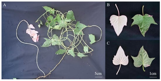 A spontaneous albino leaf mutant was identified in sweetpotato, exhibiting pronounced phenotypic differences compared with the WT plants. As shown in Figure 1, the mutant displayed pale-white leaves and stems, in stark contrast to the green leaves and stems of WT plants, indicative of normal pigmentation. Detailed examination of leaf surfaces revealed that both the adaxial and abaxial surfaces of WT leaves were uniformly green, whereas the albino mutant leaves were entirely white, suggesting a severe deficiency in pigment accumulation.