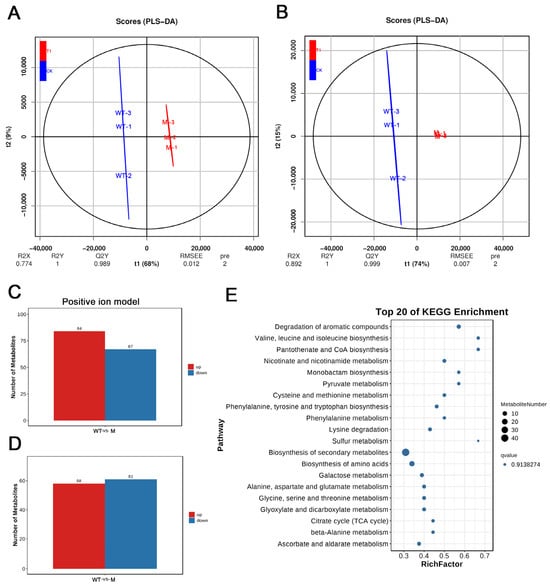 Comprehensive metabolomic overview of wild-type vs. albino leaf mutant: PLS-DA, differential metabolite counts, and KEGG pathway enrichment. (A) Positive-ion PLS-DA score plot showing clear separation between wild-type and mutant albino leaf mutant. (B) Negative-ion PLS-DA score plot showing clear separation between wild-type and mutant albino leaf mutant. (C) Number of significantly altered metabolites detected in the positive-ion mode. (D) Number of significantly altered metabolites detected in the Negative-ion mode. (E) Top 20 enriched KEGG pathways of differential metabolites ranked by enrichment factor (bubble size) and −log10(p-value) (color intensity).