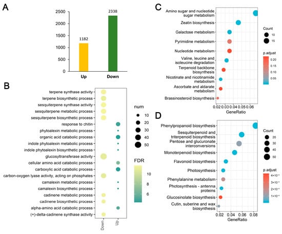 Transcriptomic analysis of differentially expressed genes (DEGs). (A) The number of up-regulated and down-regulated DEGs. (B) Gene Ontology (GO) enrichment analysis of up-regulated and down-regulated DEGs. (C,D) KEGG pathway enrichment analysis for up-regulated and down-regulated DEGs, respectively.
