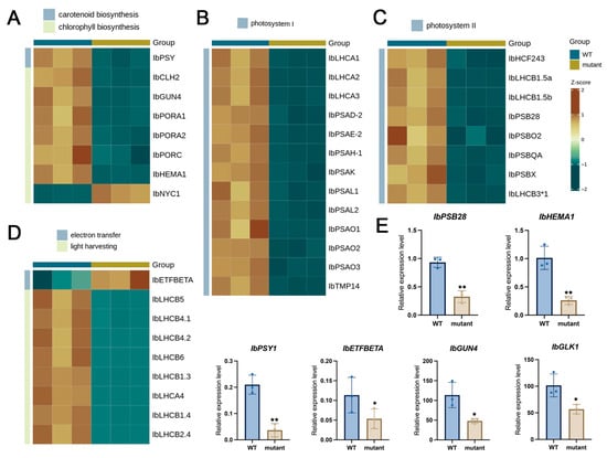 Expression analysis of differentially expressed genes (DEGs) related to photosynthesis and pigment biosynthesis pathways in WT and mutant plants. (A) DEGs associated with carotenoid and chlorophyll biosynthesis. (B) DEGs encoding components of photosystem I. (C) DEGs encoding components of photosystem II. (D) DEGs involved in electron transfer and light harvesting including specific genes highlighted in a WT vs. mutant comparison. (E) qRT-PCR validation of six selected genes. Rows represent individual genes, and columns represent biological groups (WT and mutant). The color scale indicates Z-score normalized expression levels, with red representing up-regulation and blue representing down-regulation. * and ** indicate significant differences compared with WT at p < 0.05 and p < 0.01, respectively (Student’s t-test).
