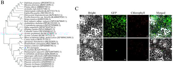 Subcellular localization was performed according to previously established methods [25]. A. tumefaciens containing pCAMBIA1300-IlMYB86-GFP and the empty vector pCAMBIA1300-GFP were cultured and collected, and pCAMBIA1300-GFP was used as a control. Bacterial cells were resuspended in 10 mM MgCl2 to an OD600 of 1.5, followed by the addition of acetosyringone to a final concentration of 200 µM. The bacterial solution was incubated for 3 h in the dark and then injected into the abaxial surface of N. benthamiana leaves using syringes. The injected N. benthamiana plants were cultured in the dark for 12 h, followed by 3 d in photoperiod. The expression of the MYB86-GFP fusion protein was observed via laser confocal microscopy (LSM800 with Airyscan, ZEISS, Oberkochen, Germany).