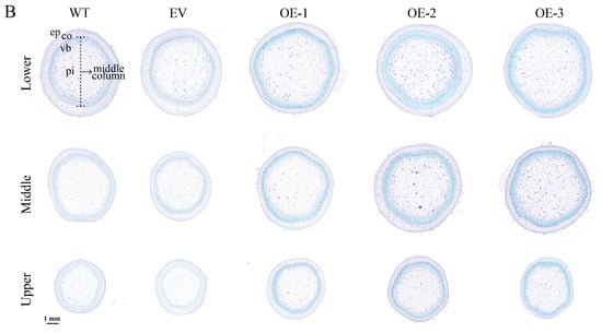 Paraffin sections combined with aniline blue staining were used to observe the cross-sections of tobacco stems. The upper part (the stem segment of the 2nd–4th node from the top bud), the middle part (the stem segment of the 6th-8th node), and the lower part (the stem segment of the 10th–12th nodes) of the stems of the WT, EV and OE tobaccos were collected. The tissues were trimmed to 2–3 mm thickness, softened in a plant softening solution at 55 °C, and then processed through dehydration in a graded ethanol series, clearing in xylene, and infiltration with paraffin wax. Following embedding and solidification, the blocks were sectioned into 5 μm thick sections using a paraffin microtome (Zhejiang TOP Cloud-Agri Technology Co., Ltd.). Following deparaffinization and rehydration, the sections were stained with Safranin O, counterstained with Fast Green, dehydrated, cleared in xylene, and mounted with neutral balsam. Stained sections were examined and imaged under a microscope (Leica DM2255, Leica Microsystems, Wetzlar, Germany).