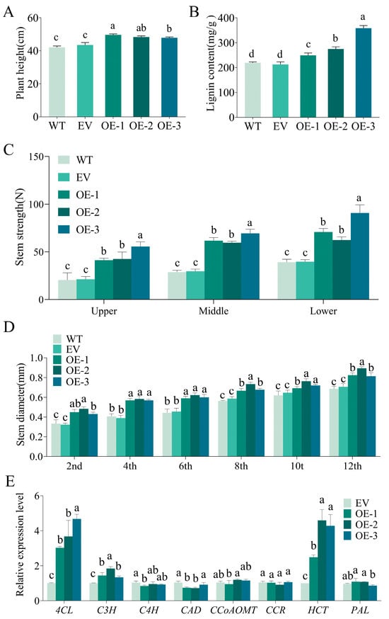 Phenotypic data, lignin content and lignin biosynthesis pathway-related gene expression of IlMYB86 transgenic tobacco plants. (A) Plant heights of the WT, EV, and OE lines. (B) The lignin content of the WT, EV, and OE lines. (C) Stem strength of the upper, middle and lower parts of the WT, EV, and OE lines. (D) The stem diameter of sections 2, 4, 6, 8, 10 and 12 of the WT, EV, and OE lines from top to bottom. (E) Expression of genes encoding enzymes related to lignin synthesis in the EV and OE lines. Different letters on the bar chart represent significant differences, p < 0.05.