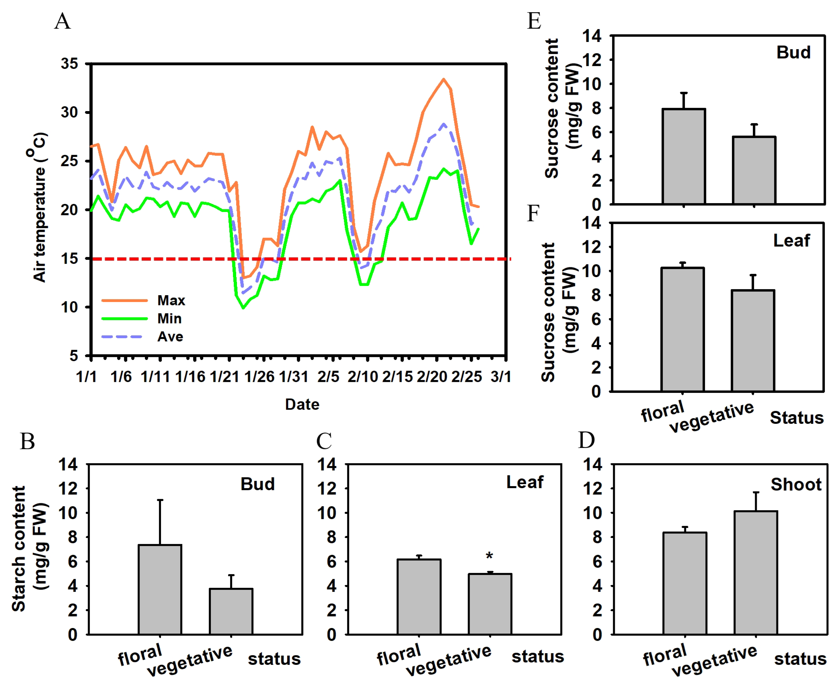Figure 1. Climate conditions and carbohydrate profiles associated with bud fate in ‘Ziniangxi’. (A) Daily air temperature in Chengmai, Hainan (January–February 2024); the red dashed line marks 15 °C, and the season featured short, late cold spells with prolonged rainy, overcast conditions. (BD) Starch content in terminal buds, leaves, and terminal shoots, comparing shoots that proceeded to floral transition (Floral) versus those that reverted to vegetative growth (Vegetative). (E,F) Sucrose content in buds and leaves for the same stages as described for B–D. “Floral” denotes buds that developed into inflorescences, whereas “vegetative” denotes buds that reverted to leafy (vegetative) growth. Error bars represent the standard error of the mean. Asterisks indicate significant differences (* p < 0.05; Student’s t-test, n = 4).