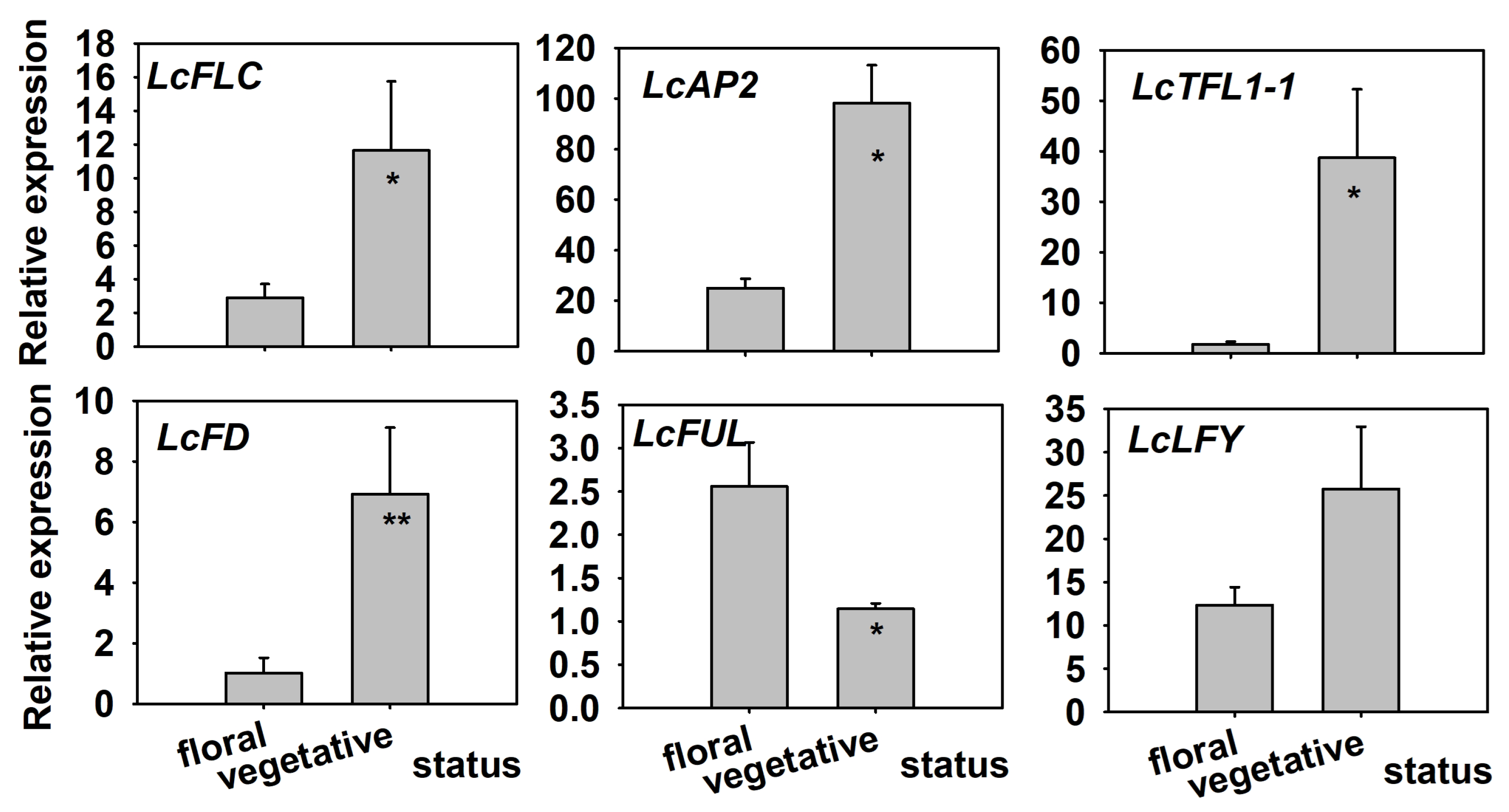 Figure 2. Relative expression of key floral regulators (LcFLC, LcAP2, LcTFL1-1, LcFD, LcLFY, LcFUL) in terminal buds during floral transition and vegetative reversion. Expression values were normalized to LcActin and expressed as fold change relative to vegetative buds ( 2 Δ Δ C p ). Error bars represent the standard error of the mean. Asterisks indicate significant differences (* p < 0.05, ** p < 0.01; Student’s t-test, n = 4).