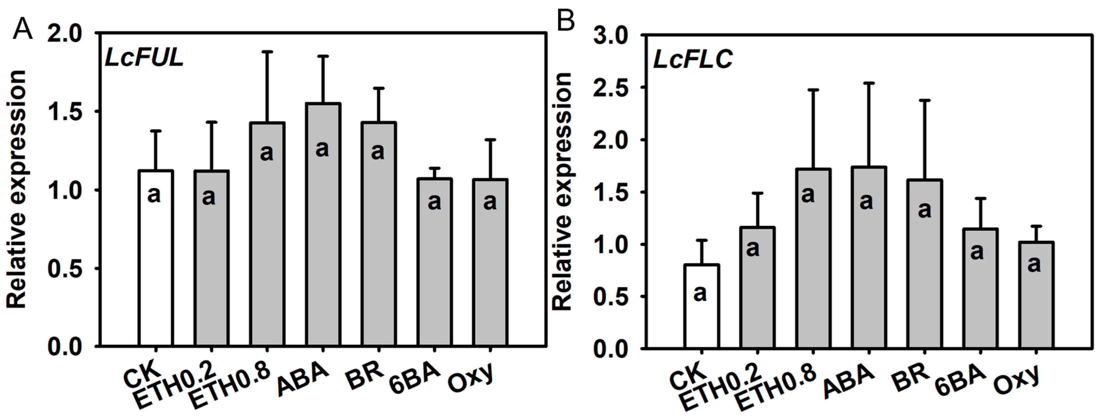 Figure 5. Relative expression of LcFUL and LcFLC in terminal buds of ‘Ziniangxi’ after single-agent PGR treatments. (A) Relative expression of LcFUL. (B) Relative expression of LcFLC. Expression values were normalized to LcActin and expressed as fold change relative to CK ( 2 Δ Δ C p ). Bars represent mean ± SE ( n = 4 ). Same letters above columns denote no significant differences between treatments according to Tukey (HSD) test at p < 0.05 .