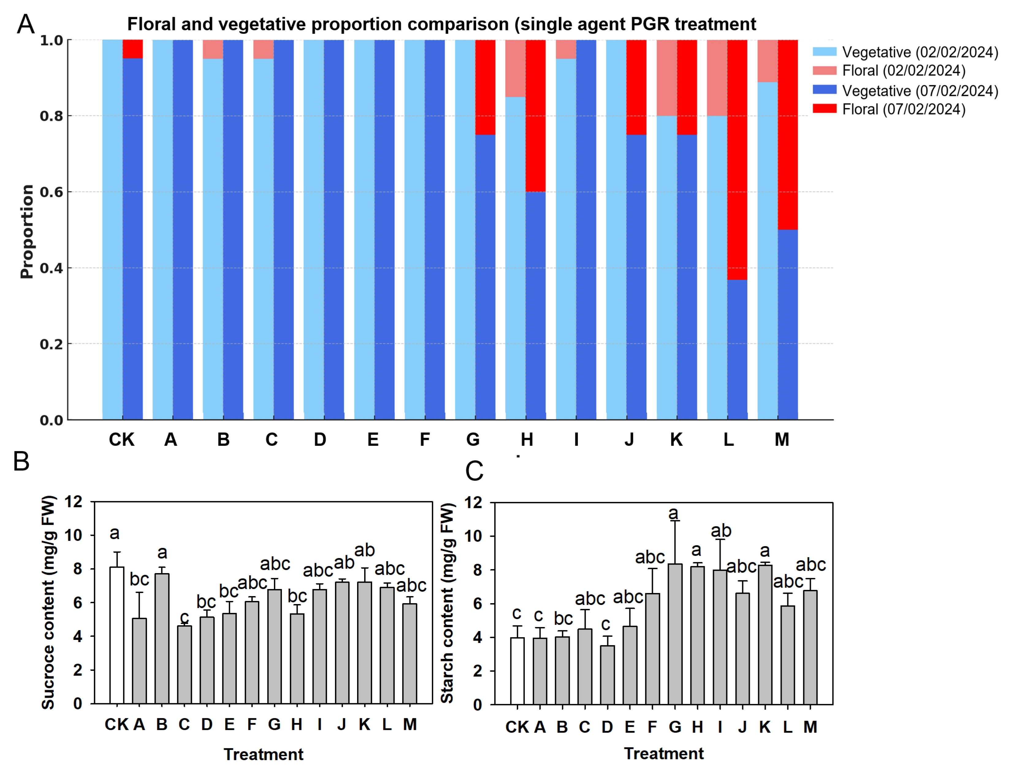 Figure 6. Floral/vegetative outcomes and leaf carbohydrate responses to composite PGR treatments in ‘Ziniangxi’. (A) Proportion of shoots in vegetative versus floral states across 13 composite treatments and the water control (CK). Colors denote phenological stage and observation date: vegetative on 2 February (light blue), floral on 2 February (light red), vegetative on 7 February (dark blue), floral on 7 February (dark red). (B) Leaf sucrose concentrations after the composite PGR treatments. (C) Leaf starch concentrations after the composite treatments. Bars above the columns indicate standard error of means; Same letters above columns denote no significant differences between treatments according to Tukey (HSD) test at p < 0.05 .