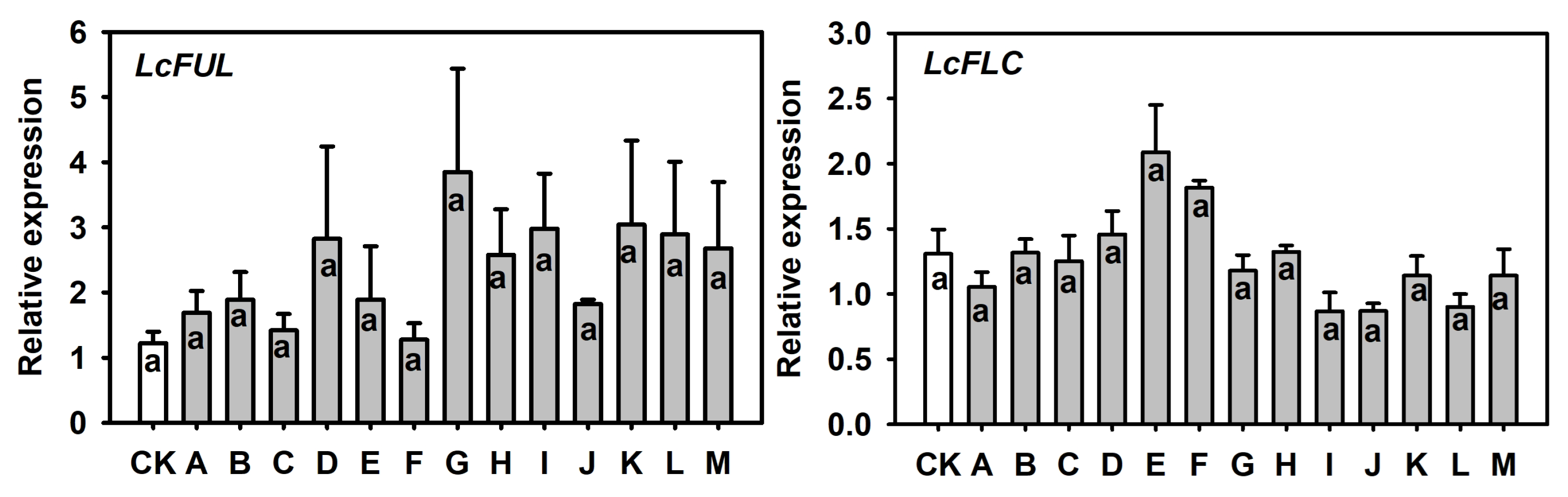 Expression of LcFUL and LcFLC in terminal buds under composite PGR applications showed numerical differences among treatments but no statistically significant differences relative to the control (Figure 7). Nevertheless, composite treatments with very low or no inflorescence formation, such as E and F, tended to have the lowest LcFUL and highest LcFLC transcript levels, whereas applications associated with higher flowering proportions (e.g., H, K, L and M) generally showed higher LcFUL and slightly reduced LcFLC expression. These qualitative trends are consistent with the contrasting floral versus vegetative outcomes observed among composite treatments.