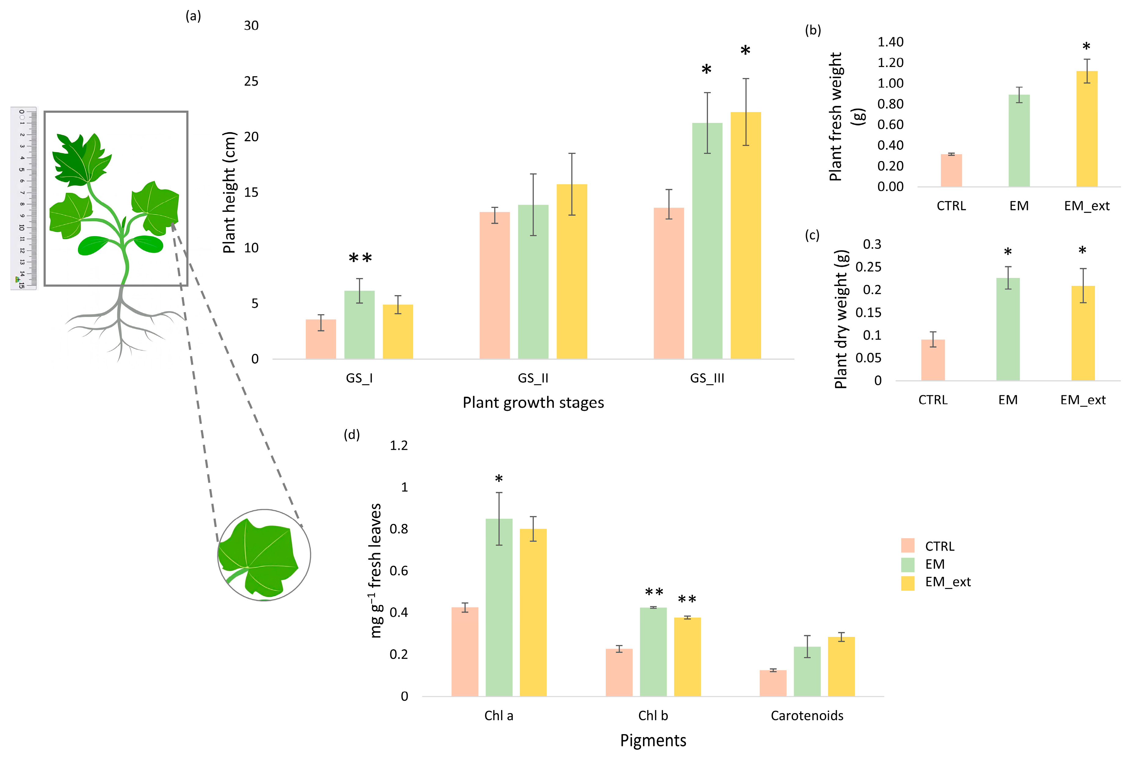 3.1. Impact of EM and EM Extract on Vegetative and Root Development of Zucchini Plants
