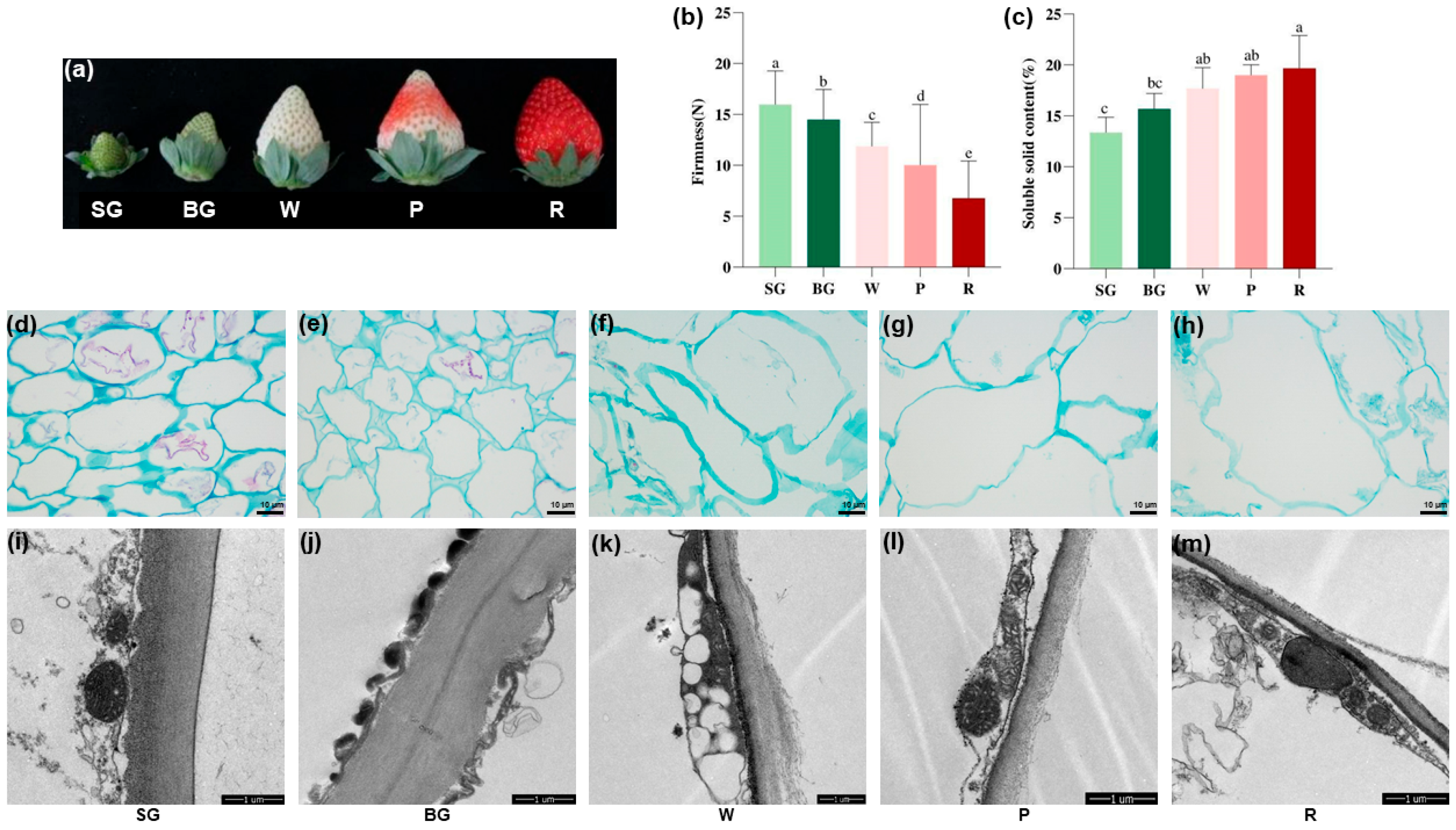3.1. Changes in Firmness, SSC, and Cell Microstructure During Strawberry Ripening