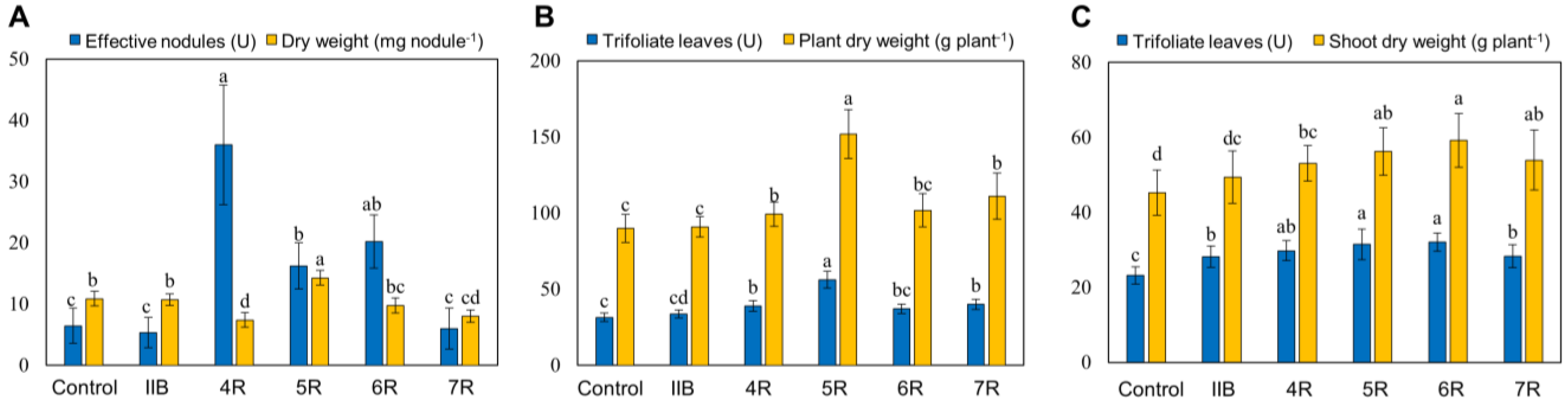 3.3. Effects of Rhizobia on Nodulation and Growth of C. ensiformis